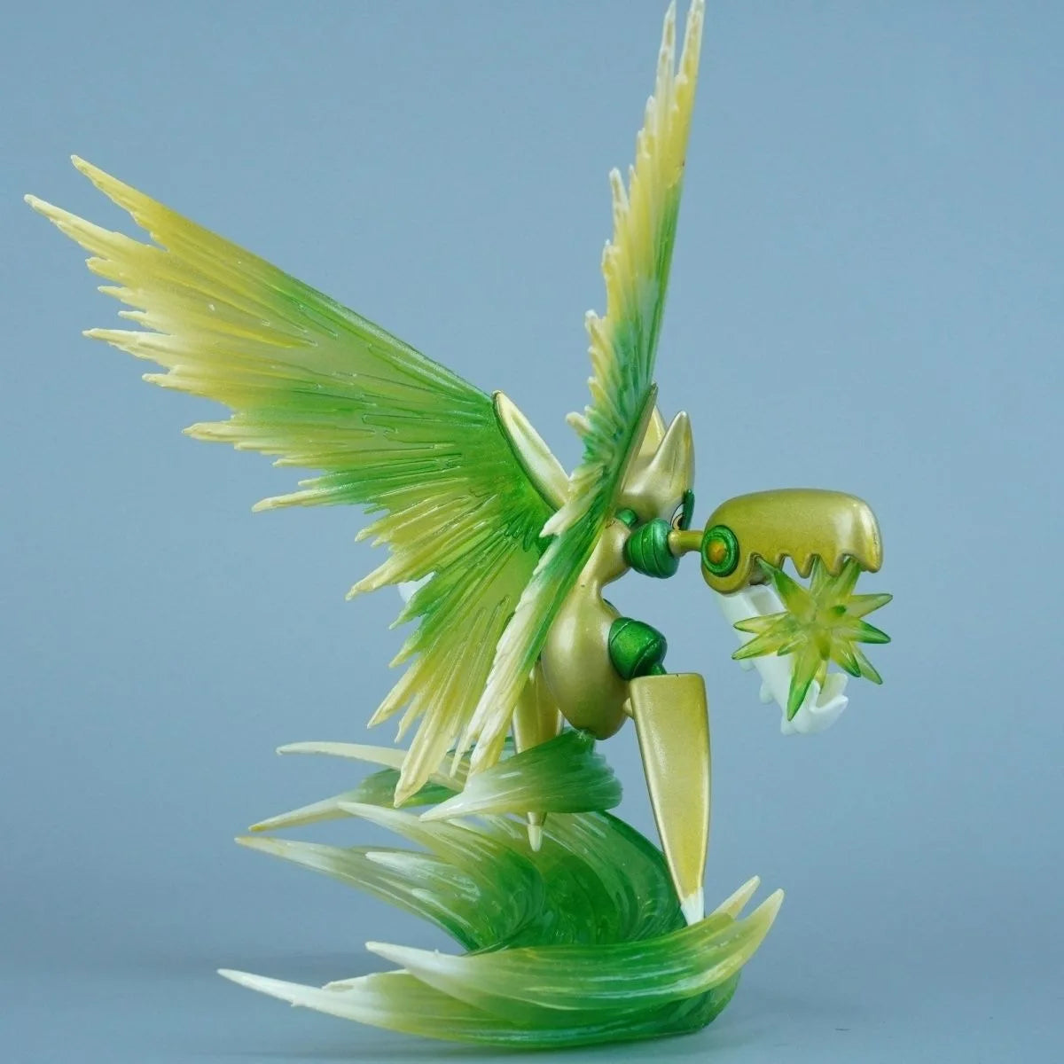 Mega Scizor aparece en una pose de ataque aéreo, con alas extendidas y un potente remolino de energía que envuelve la base, transmitiendo velocidad, fuerza y precisión. El esculpido mecánico respeta a la perfección su naturaleza tipo Bicho/Acero, con acabados afilados y proporciones robustas que realzan su carácter ofensivo.