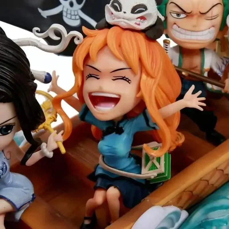 Salpa per l'avventura definitiva con questa spettacolare figure dei Pirati di Cappello di Paglia a bordo della Nave Drago di Wano, un pezzo unico che cattura l'essenza dello spirito pirata di One Piece.