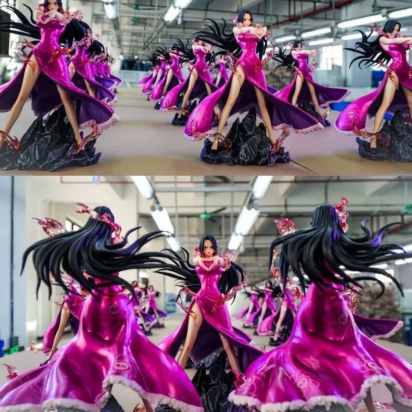 The face displays a firm and confident expression, true to the dominant character of the most admired Shichibukai in the pirate world. Her dark hair, sculpted in detailed strands, adds dynamism and visual depth to the figure. The realistically finished rocky base provides stability and a perfect contrast to the pink energy of the attack, enhancing the overall presence of the piece.