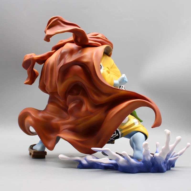 The sculpture features Jinbe in his signature yellow kimono decorated with skulls, green belt, and flowing brown cape, performing a powerful water technique, with a translucent effect that enhances the intensity of the scene. The firm pose, focused expression, and details on his clothing capture the essence of this honorable warrior, a symbol of loyalty and bravery in One Piece.