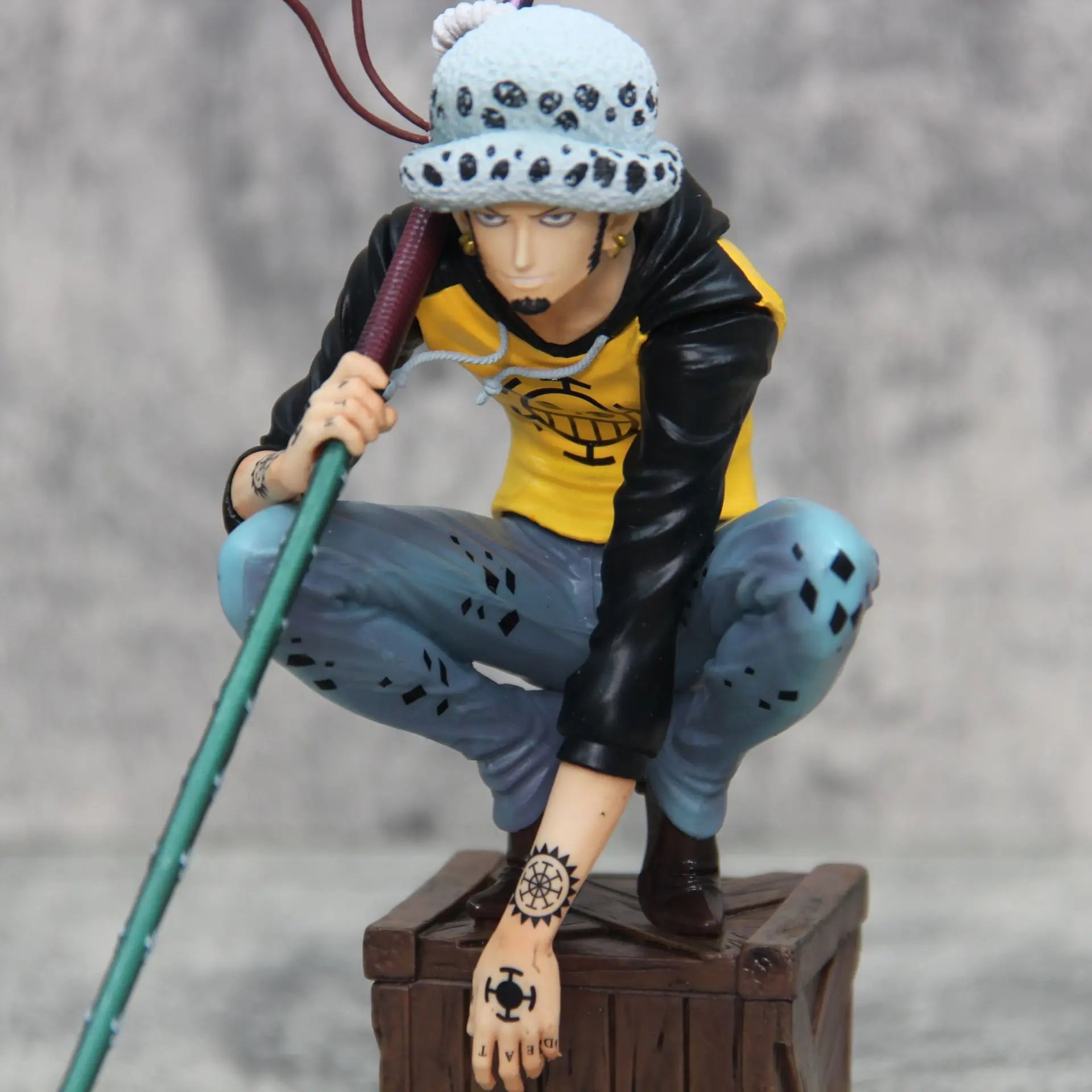 With dynamic and realistic sculpting, this figure shows Law crouching over a wooden crate, wielding his katana Kikoku with a defiant attitude.