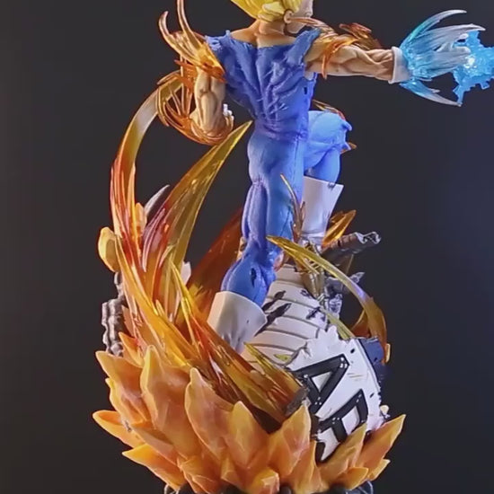 Inspired by his epic showdown with Cell, this piece captures Vegeta in one of his most explosive moments, combining extreme detail, energy, and visual drama. The sculpture depicts Vegeta in the midst of a Final Impact attack, his arm extended, a blue energy aura enveloping his hand, while waves of golden power emerge from the base.