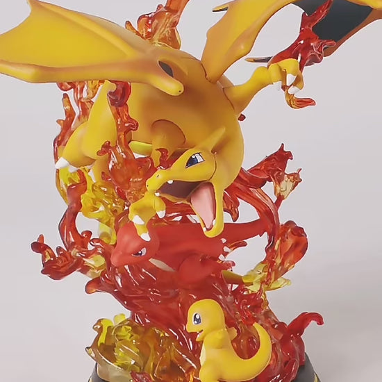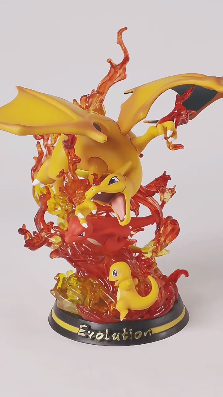 Revive a evolução completa de Charmander com esta espetacular figura Pokémon Charizard Evolution de 24 cm da MF Studio. A peça apresenta Charmander, Charmeleon e Charizard numa sequência dinâmica envoltos em chamas translúcidas vermelhas e laranja, simbolizando o seu poder crescente e a força do tipo Fogo. Com um design em espiral que envolve os três Pokémon, esta estátua capta na perfeição a essência da evolução mais icónica da série. Feita com acabamentos de alta qualidade e detalhes precisos, é um tesouro para colecionadores e fãs que procuram uma peça de exposição marcante.