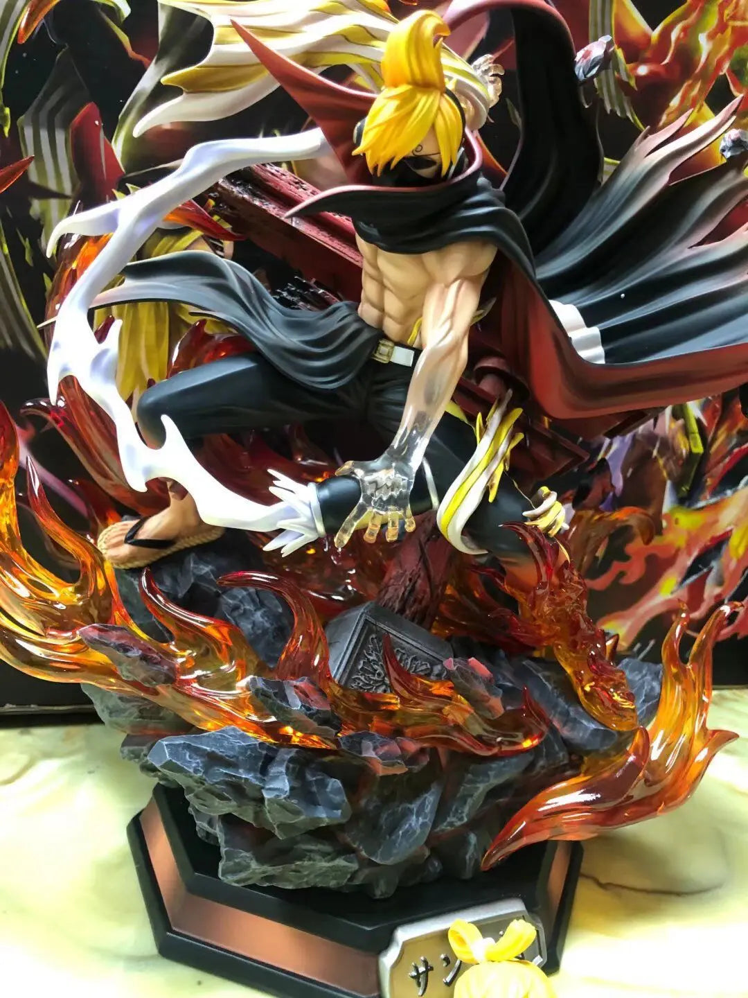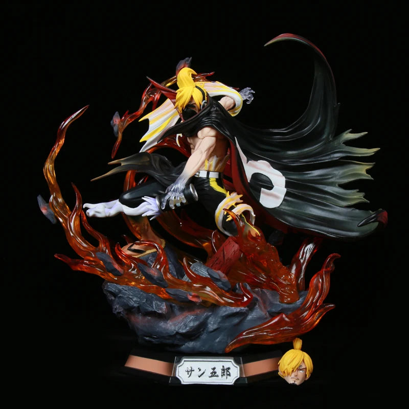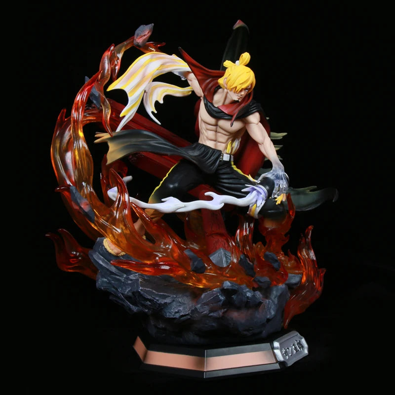 A figura apresenta um Sanji sem camisola, com músculos definidos e o seu característico cabelo loiro esvoaçante. O contraste entre a capa preta e vermelha, os efeitos translúcidos do fogo e a base rochosa conferem a esta peça uma presença imponente. Cada detalhe, desde as rugas das suas calças ao dinamismo das chamas, foi cuidadosamente elaborado para transmitir movimento e poder.