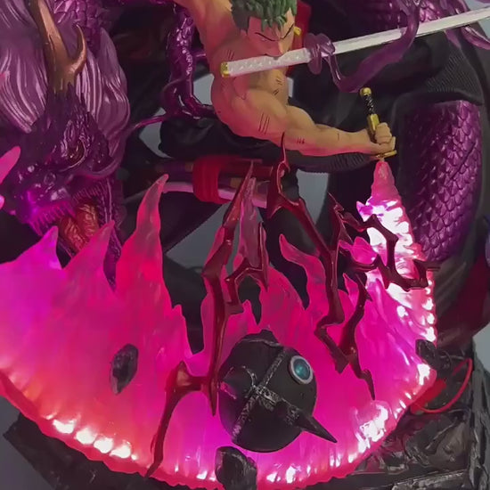 No centro da composição, vemos Zoro a desferir um ataque devastador, acompanhado por um dragão de energia FengYu que envolve a cena com escamas roxas, efeitos translúcidos e uma presença colossal. A figura destaca-se pelo seu acabamento profissional: musculatura definida, cortes de batalha, sombreado profundo e pintura premium em tons vibrantes que realçam cada espada, cada gesto e cada movimento.